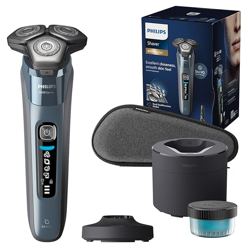 Included components | 1 x Philips Shaver Series 8000 in Ice Blue, 1 x Charging Stand, 1 x Cleaning Brush, 1 x Travel Case, 1 x Quick cleaning pod, 1 x cleaning cartridge and 1 x Pop-up Trimmer |
