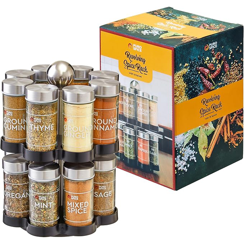 - Practical: keep your kitchen worktop tidy with this spice rack, storing spices, herbs and condiments; It has a turning mechanism, helping you find whatever spice jars you require when cooking.